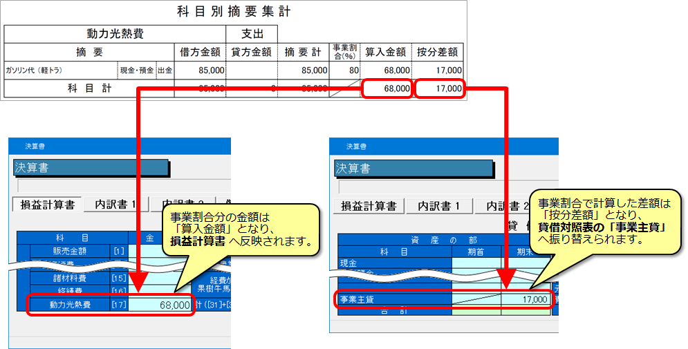 ホーム摘要登録 事業割合が80%の摘要を使用した場合、残りの20%の金額はどこに反映されますか? 2018年8月20日2025年3月14日 SHARE ポスト シェア はてブ LINE 入力した金額のうち80%分は農業経費として損益計算書へ計上されますが、残りの20%分(按分差額)は貸借対照表の「事業主貸」科目へ振り替えられます。 摘要ごとに事業割合が適用された金額(経費算入金額、按分差額)を確認したい場合は、科目別摘要集計でご確認いただけます。 Q&A番号:0402c この記事は参考になりましたか? この記事は参考になりましたか? 参考になった 参考にならなかった