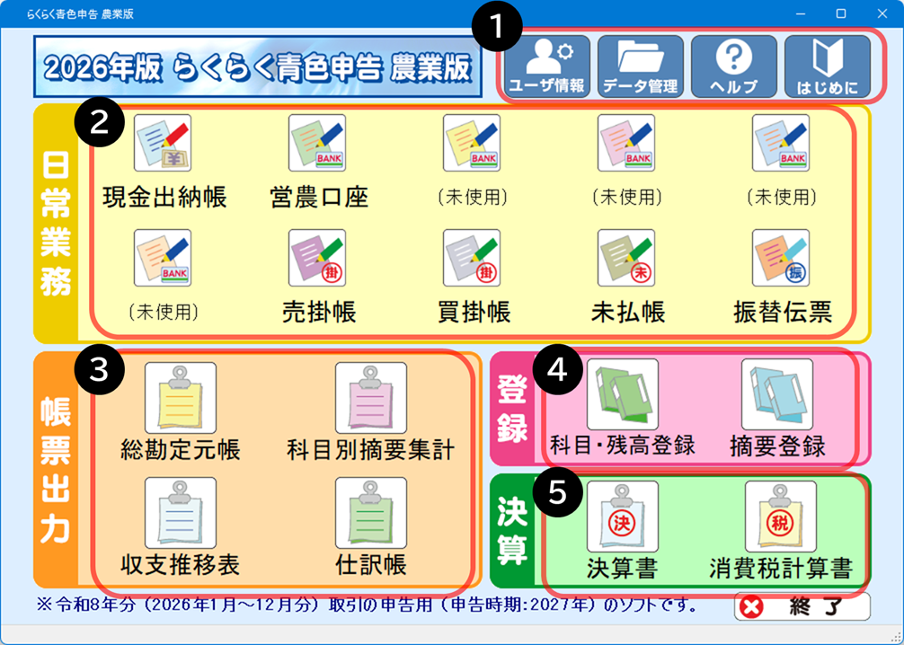 「らくらく青色申告農業版」を起動すると表示される画面です。