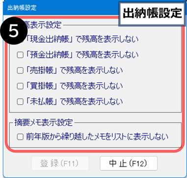 出納帳の残高表示や摘要メモ表示の設定を行います。