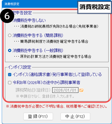 また、出納帳の残高表示や消費税の申告方法、パスワードに関する設定などを行います。