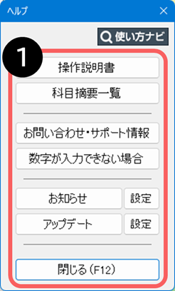 ホーム 【2026年版】「ヘルプ」について ヘルプとは 操作説明書やサポート情報を表示します。 目次 ヘルプの機能 ヘルプの使い方 よくあるご質問 ヘルプの機能 ➊ 「操作説明書」や「アップデート」などの操作を選択します。 ヘルプの使い方 「操作説明書」の確認方法(操作説明書はありますか?)「数字が入力できない場合」の使い方(数字(日付や金額等)を入力できなくなりました。) よくあるご質問 「エラー、トラブル」カテゴリへ この記事は参考になりましたか? この記事は参考になりましたか? 参考になった 参考にならなかった Q&A番号:26103a