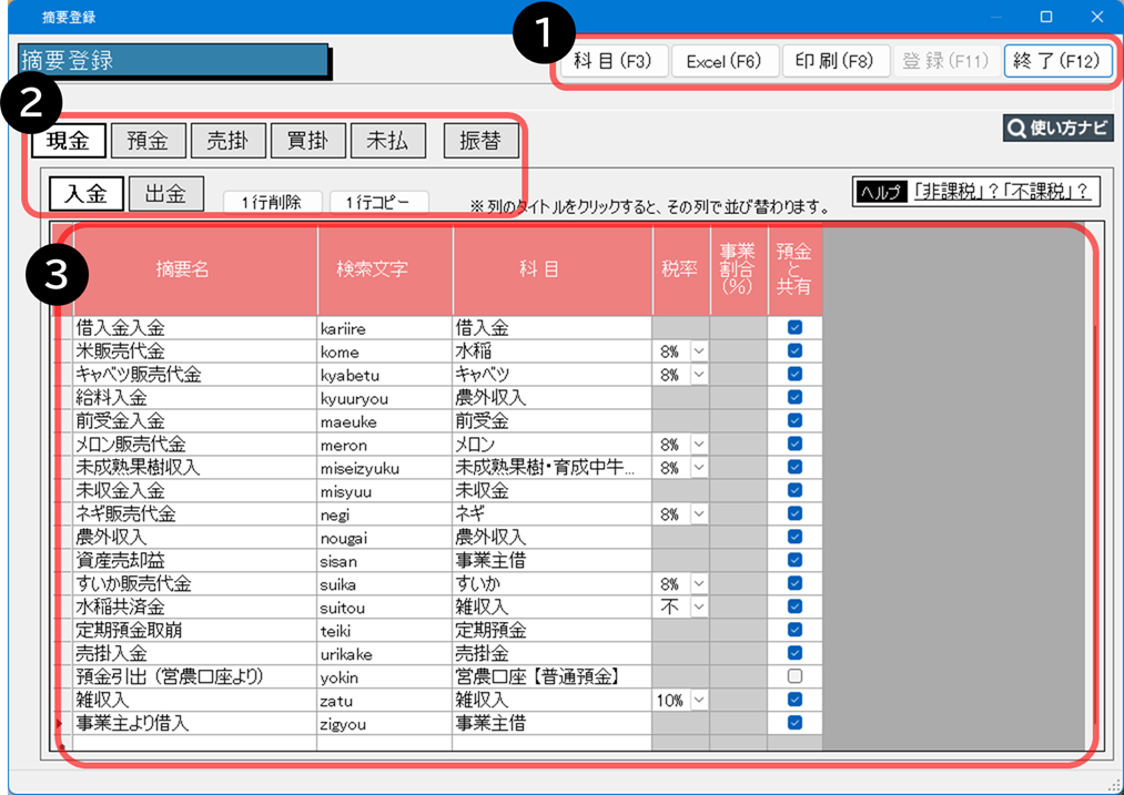 ホーム 【2026年版】「摘要登録」について 摘要登録とは 出納帳を入力する際に使用する「摘要」を登録します。出納帳で必要な摘要が表示されない場合は、出納帳を入力する前に当画面で追加してください。 目次 摘要登録の機能 摘要登録の使い方 困ったときは よくあるご質問 摘要登録の機能 ➊ 登録や印刷などの操作を行います。➋ 入力を行う摘要区分の切り替えを行います。 摘要区分は、「現金」「預金」「売掛」「買掛」「未払」「振替」の6つとなります。 また、それぞれ「入金」と「出金」等に分かれます。➌ 摘要名などを入力します。 摘要登録の使い方 摘要とはどのような項目ですか?出納帳で使用する摘要を登録する振替伝票で使用する摘要を登録する。※2025年版以降摘要を削除する摘要に事業割合を設定する/変更する摘要に消費税率を設定する/変更する「預金と共有」、「現金と共有」とは 困ったときは 同じ摘要でも事業割合が異なる取引がある場合は同じ摘要でも消費税率が異なる取引がある場合は「税率」がグレーになっていて、設定できません勘定科目の一覧表「非課税」「不課税」「免税」について よくあるご質問 「摘要登録」カテゴリへ この記事は参考になりましたか? この記事は参考になりましたか? 参考になった 参考にならなかった Q&A番号:26201a