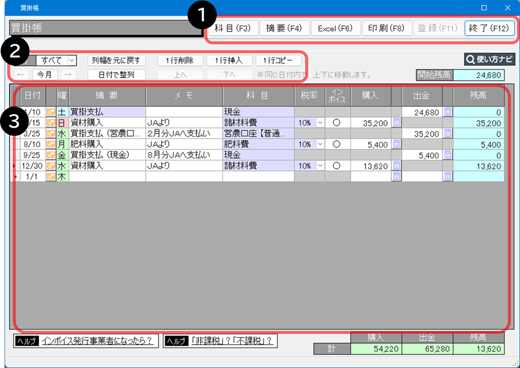 ホーム 【2026年版】「買掛帳」について 買掛帳とは 買掛での購入や買掛金の支払いなど、買掛に関する取引を入力します。 目次 買掛帳の機能 買掛帳の使い方 入力例 困ったときは よくあるご質問 買掛帳の機能 ➊ 登録や印刷などの操作を行います。➋ 入力に関する操作を行います。➌ 取引を入力します。 買掛帳の使い方 買掛を行った際の取引を入力する買掛金を支払った際の取引を入力する本年中に購入した肥料の代金を来年支払う場合の入力方法出納帳の取引に消費税率を設定する出納帳の取引に事業割合を設定する 入力例 後払いで購入した(「買掛金」で計上する)口座引き落としで「買掛金」を支払った 困ったときは 肥料等を購入しているお店ごとに買掛帳を分けて入力することはできますか?出納帳に表示された税率を修正するには勘定科目の一覧表数字(金額や日付など)を入力できない場合は入力したはずの取引が表示されません使いたい科目や摘要を探しやすくするには「税率」欄が表示されない場合は「非課税」「不課税」「免税」について よくあるご質問 「出納帳、振替伝票」カテゴリへ この記事は参考になりましたか? この記事は参考になりましたか? 参考になった 参考にならなかった Q&A番号:26303a