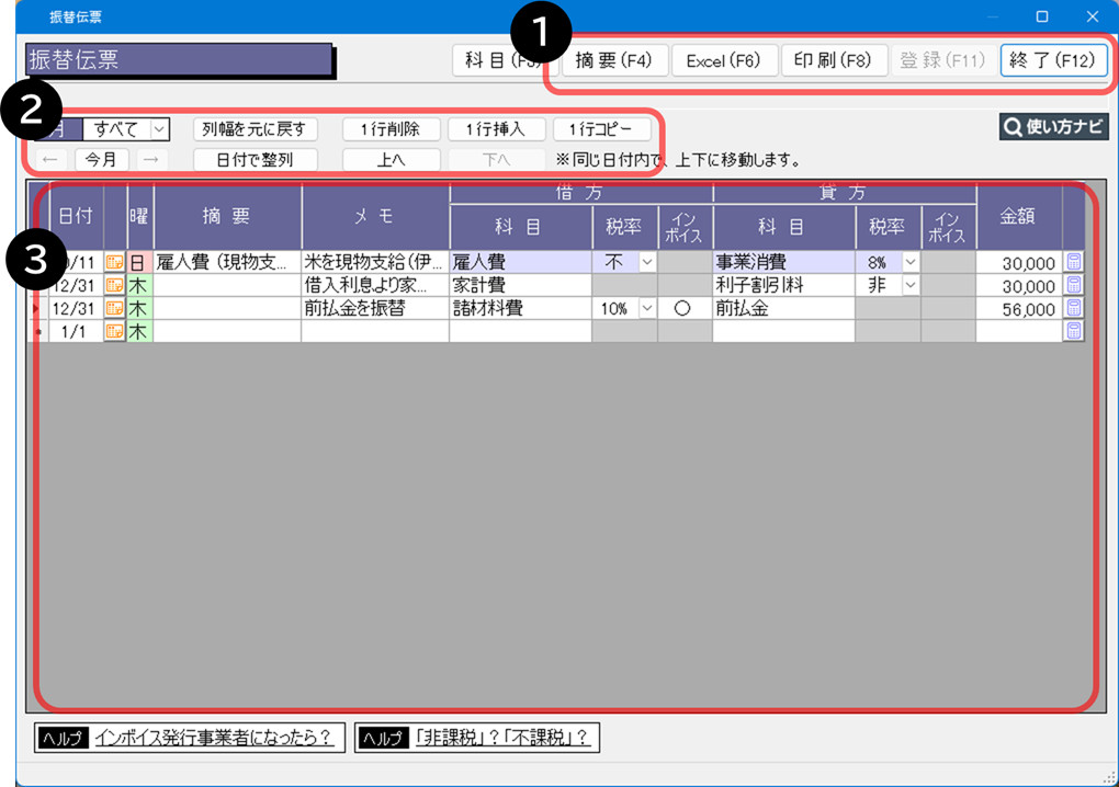 振替伝票のみ、複式簿記の形式(借方/貸方)での入力となります。
