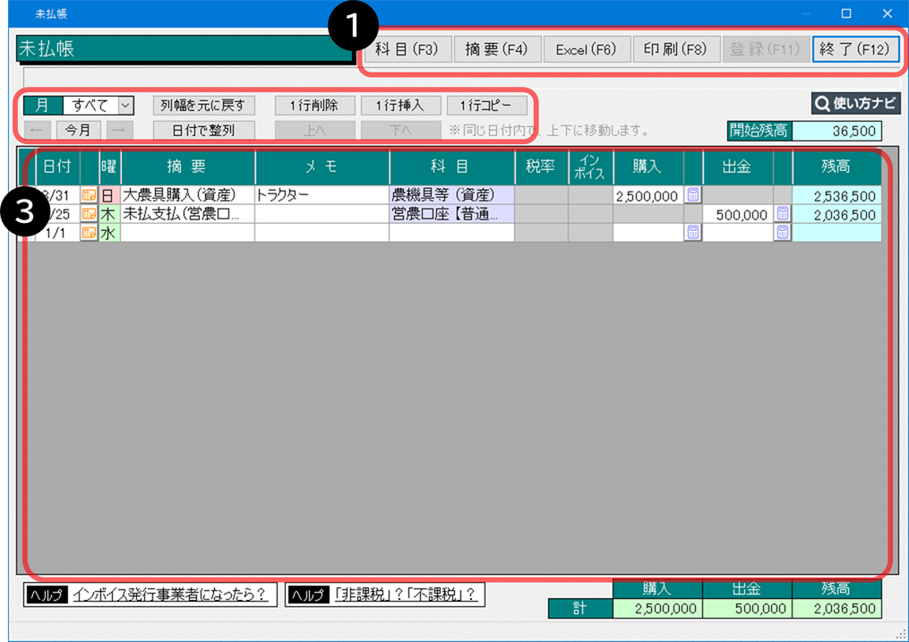 ホーム 【2026年版】「未払帳」について 未払帳とは 未払金での購入や未払金の支払いなど、未払金に関する取引を入力します。 目次 未払帳の機能 未払帳の使い方 入力例 困ったときは よくあるご質問 未払帳の機能 ➊ 登録や印刷などの操作を行います。➋ 入力に関する操作を行います。➌ 取引を入力します。 未払帳の使い方 クレジットカードで購入した際の取引を入力するクレジットカードの引き落としがあった際の取引を入力する本年中に購入した償却資産の代金を来年支払う場合の入力方法を教えてください。出納帳の取引に消費税率を設定する出納帳の取引に事業割合を設定する 入力例 償却資産を後払いで購入した(「未払金」で計上する)※2024年版以降口座引き落としで「未払金」を支払った※2024年版以降 困ったときは 勘定科目の一覧表出納帳に表示された税率を修正するには数字(金額や日付など)を入力できない場合は入力したはずの取引が表示されません使いたい科目や摘要を探しやすくするには「税率」欄が表示されない場合は「非課税」「不課税」「免税」について「インボイス制度」の開始後に必要な設定や入力を教えてください。 よくあるご質問 「出納帳、振替伝票」カテゴリへ この記事は参考になりましたか? この記事は参考になりましたか? 参考になった 参考にならなかった Q&A番号:26305a
