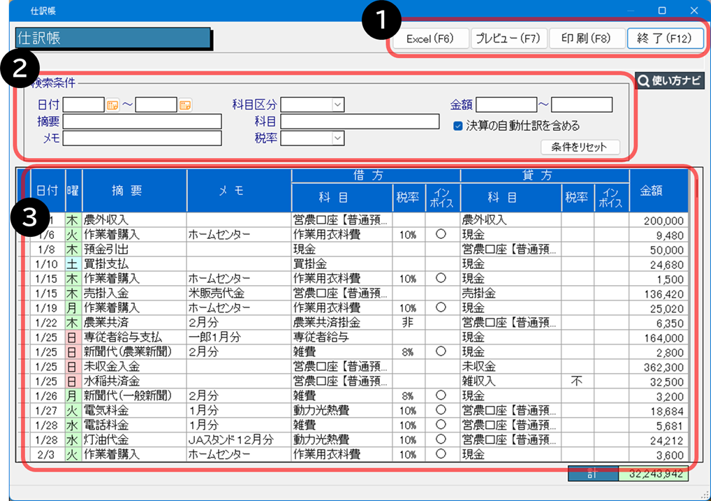 全ての取引を日付順に複式簿記の形式で出力します。