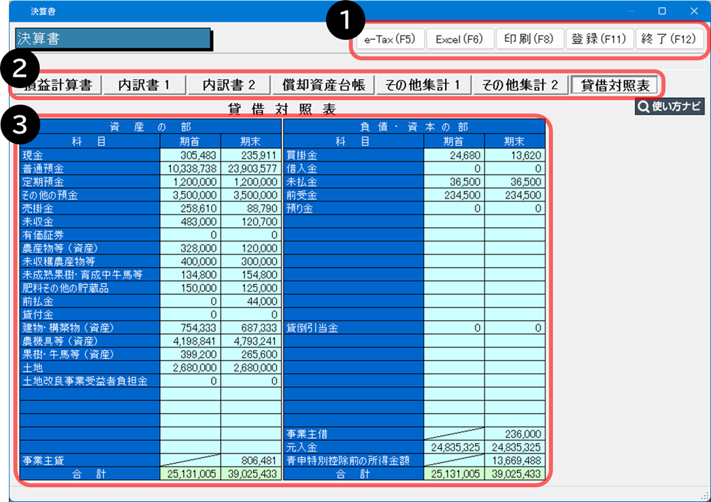 ホーム 【2026年版】「決算書(貸借対照表)」について 貸借対照表とは 「所得税青色申告決算書(農業所得用)」の「貸借対照表」です。出納帳や振替伝票などで入力した内容を元に、すべて自動計算されます。 目次 貸借対照表の機能 貸借対照表の使い方 困ったときは よくあるご質問 貸借対照表の機能 ➊ 登録や印刷などの操作を行います。➋ 入力を行う画面の切り替えを行います。➌ 水色の金額欄は、出納帳などに入力した内容から自動計算されます。 貸借対照表の使い方 「貸借対照表」作成の基本決算書の印刷画面についてe-Tax出力機能について 困ったときは 作成コーナーで青色申告決算書を作成するには New!貸借対照表の金額を、手入力で修正することはできますか? よくあるご質問 「決算書」カテゴリへ この記事は参考になりましたか? この記事は参考になりましたか? 参考になった 参考にならなかった Q&A番号:26504a