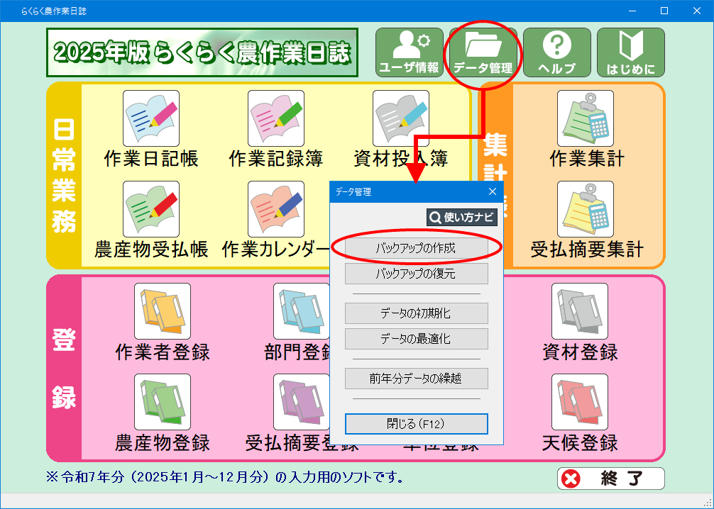 (2) メインメニュー右上の データ管理 から「バックアップの作成」を選択します。