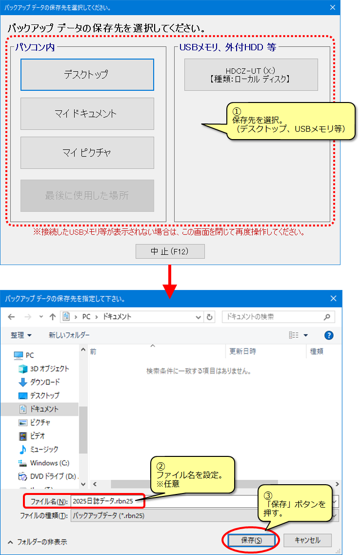 (3) 表示された画面でバックアップファイルの保存先(デスクトップ、USBメモリ等)を指定して保存します。