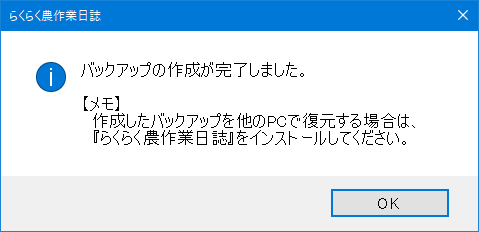 (4) 「バックアップの作成が完了しました。」と表示されたら保存完了です。