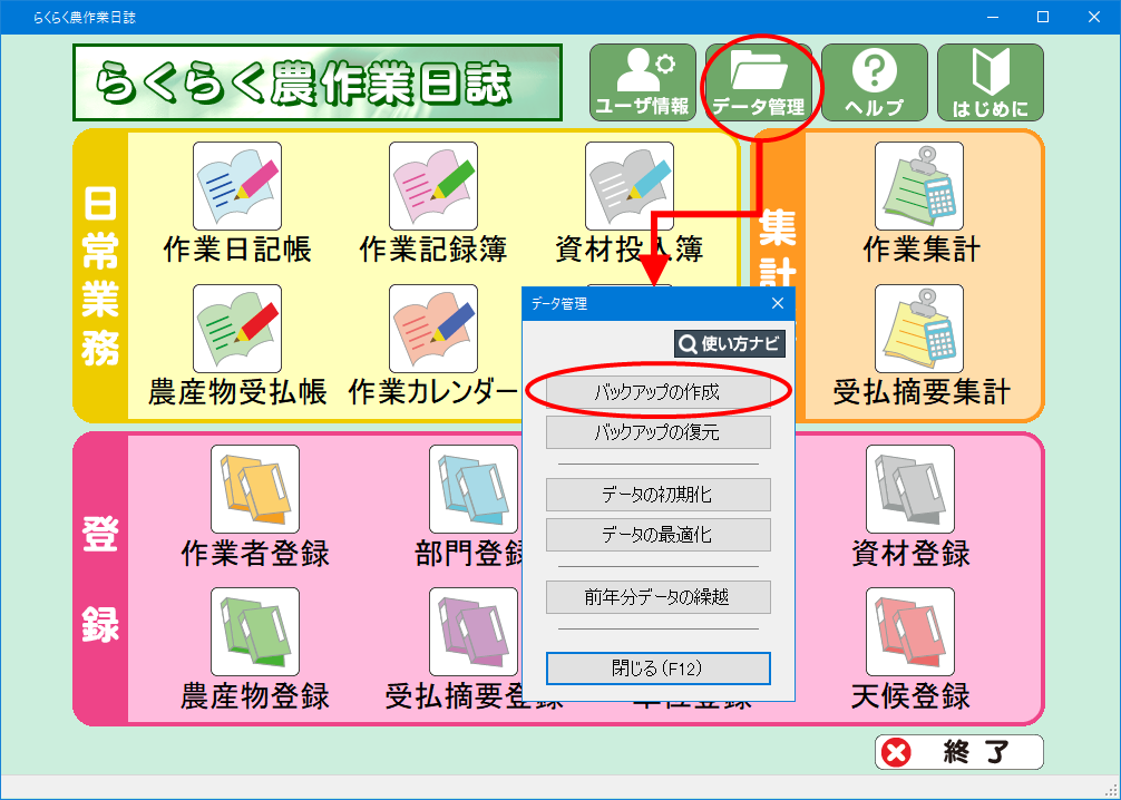 (2) メインメニュー右上の データ管理 から、「バックアップの作成」を選択します。
