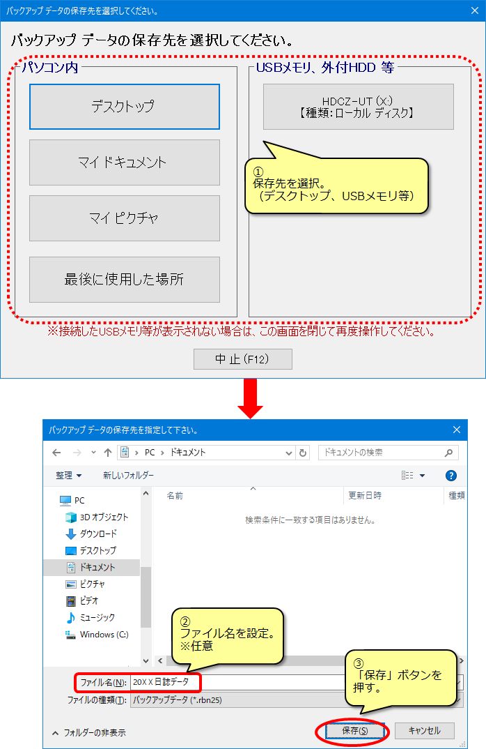 (3) 表示された画面でバックアップファイルの保存先(USBメモリ等)を指定して保存します。