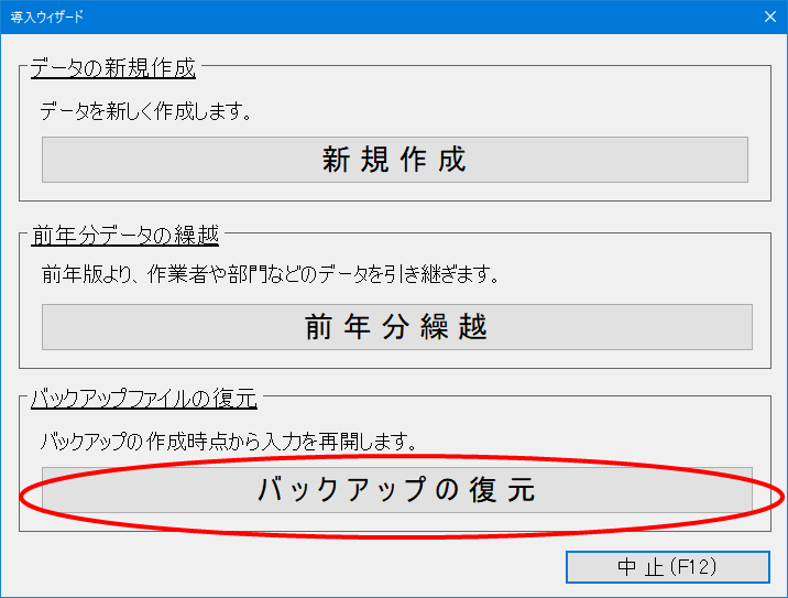 (2) 導入ウィザード画面で「バックアップの復元」を選択します。