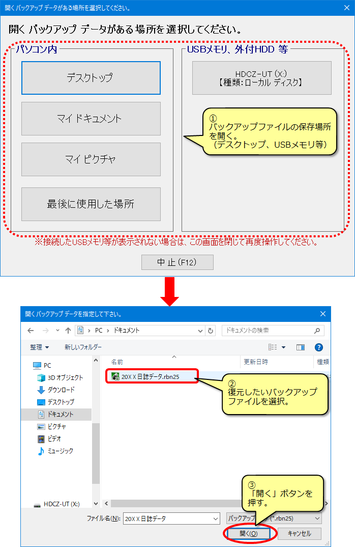 (5) 表示された画面で復元したいデータのバックアップファイルを選択し、復元を実行します。
