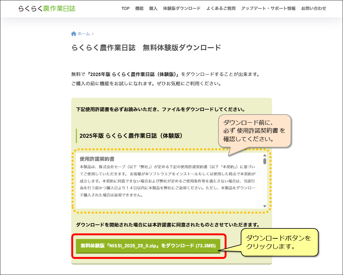 (2) 必ず 使用許諾契約書 をお読みいただき、ダウンロードボタンをクリックします。