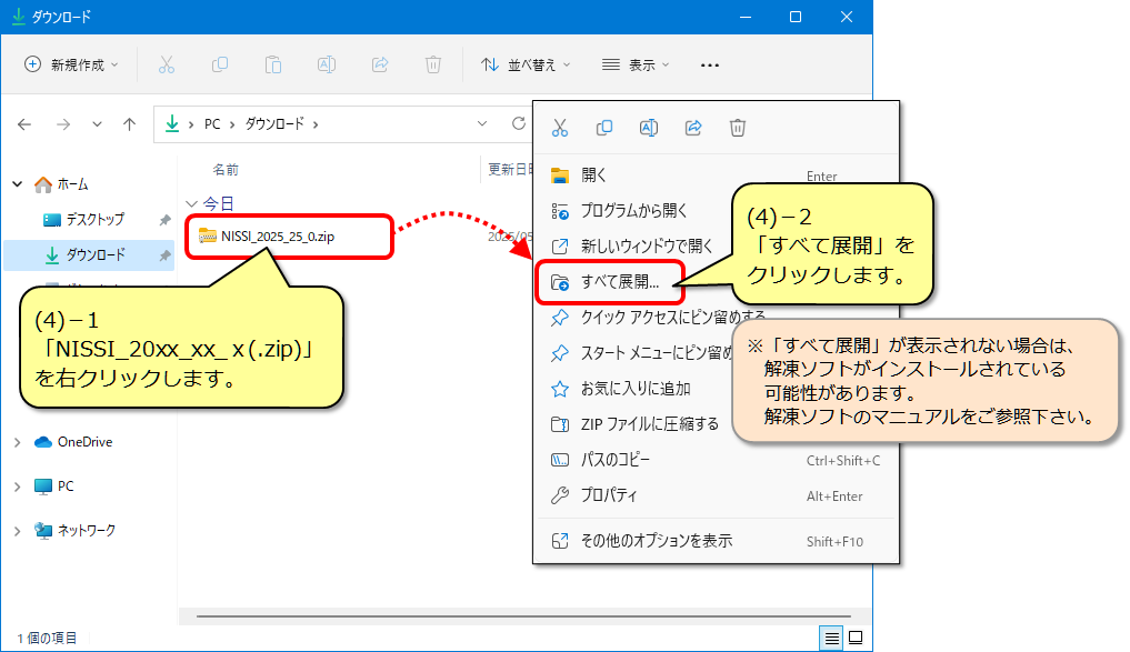 (4) 「NISSI_20xx_xx_x(.zip)」を右クリックし、表示されたメニューから「すべて展開」をクリックします。