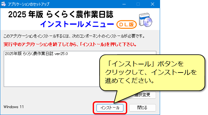 (8) 「らくらく農作業日誌 インストールメニュー(DL版)」が表示されますので、画面の案内に従ってインストールを行ってください。