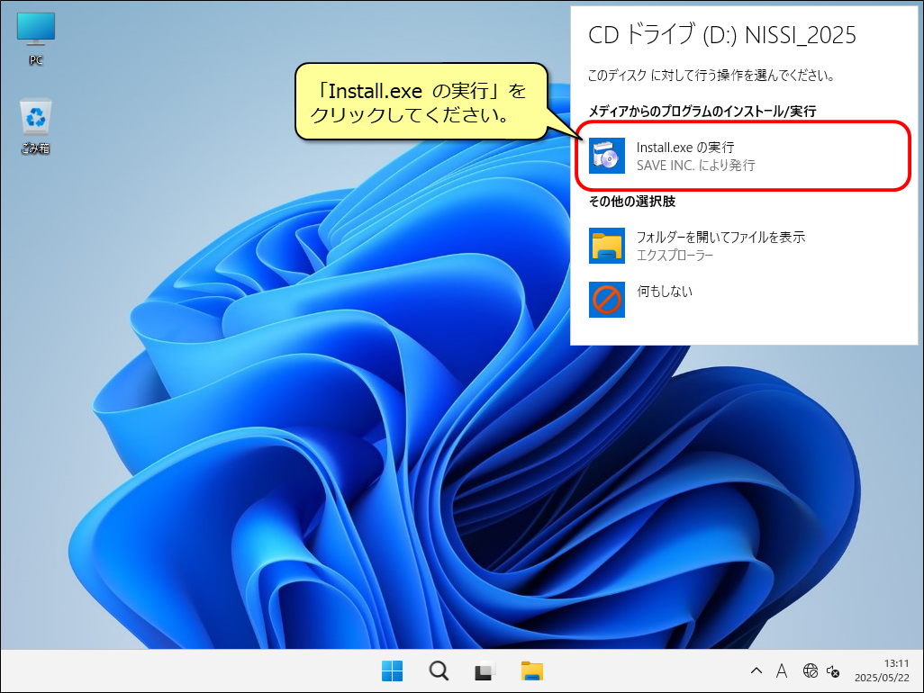 (1) CDをセットした後、画面右側に以下のようなメッセージが表示されますのでクリックします。