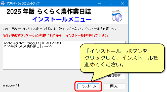 (2) インストールメニューが表示されますので、画面の案内に従ってインストールを行ってください。