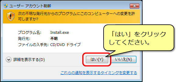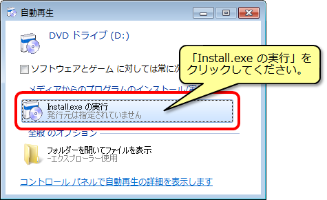 (1) CDをセットした後、以下のような画面が表示されたら、「Install.exe の実行」をクリックします。