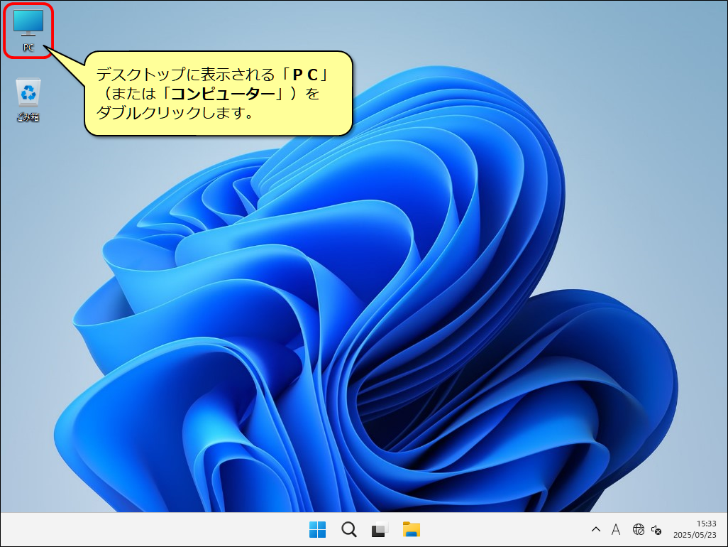 (1) デスクトップ等から「PC」または「コンピューター」を開きます。