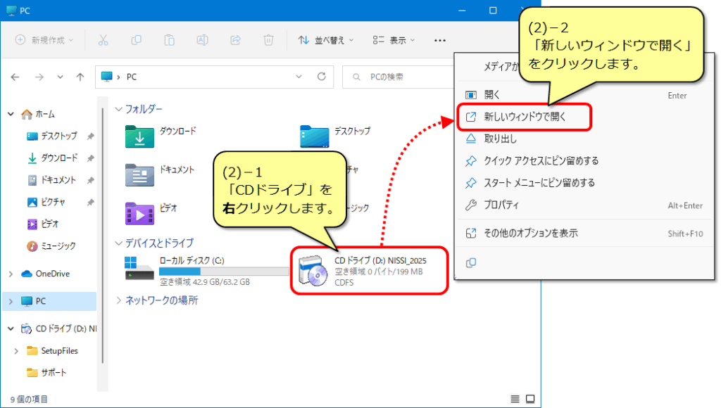(2) CDドライブ(DVDドライブ、BDドライブ等)を右クリックして、表示されたメニューから「新しいウィンドウで開く」をクリックします。