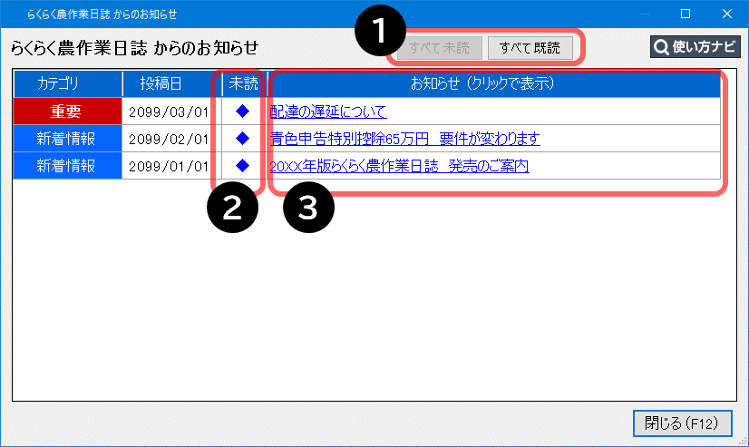 ソフトを起動した際、新しいお知らせがある場合に表示されます。