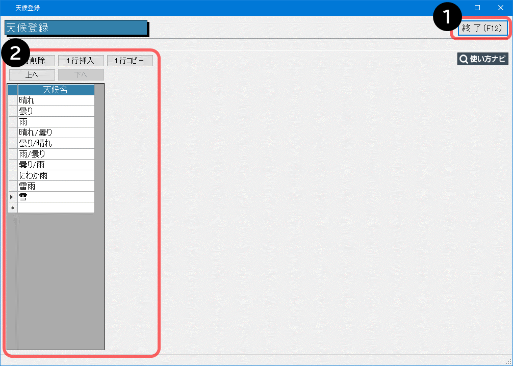 天候は、「作業日記帳」などに天候を入力する際に使用します。