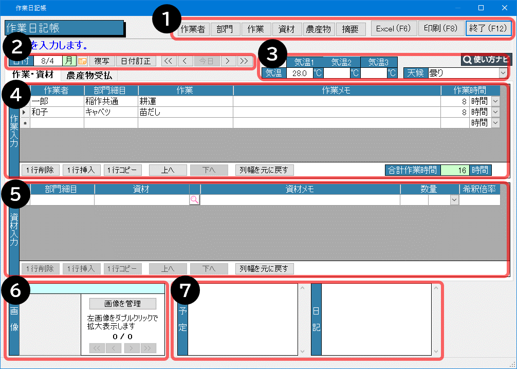 | ➐ 予定と日記の入力を行います。 |