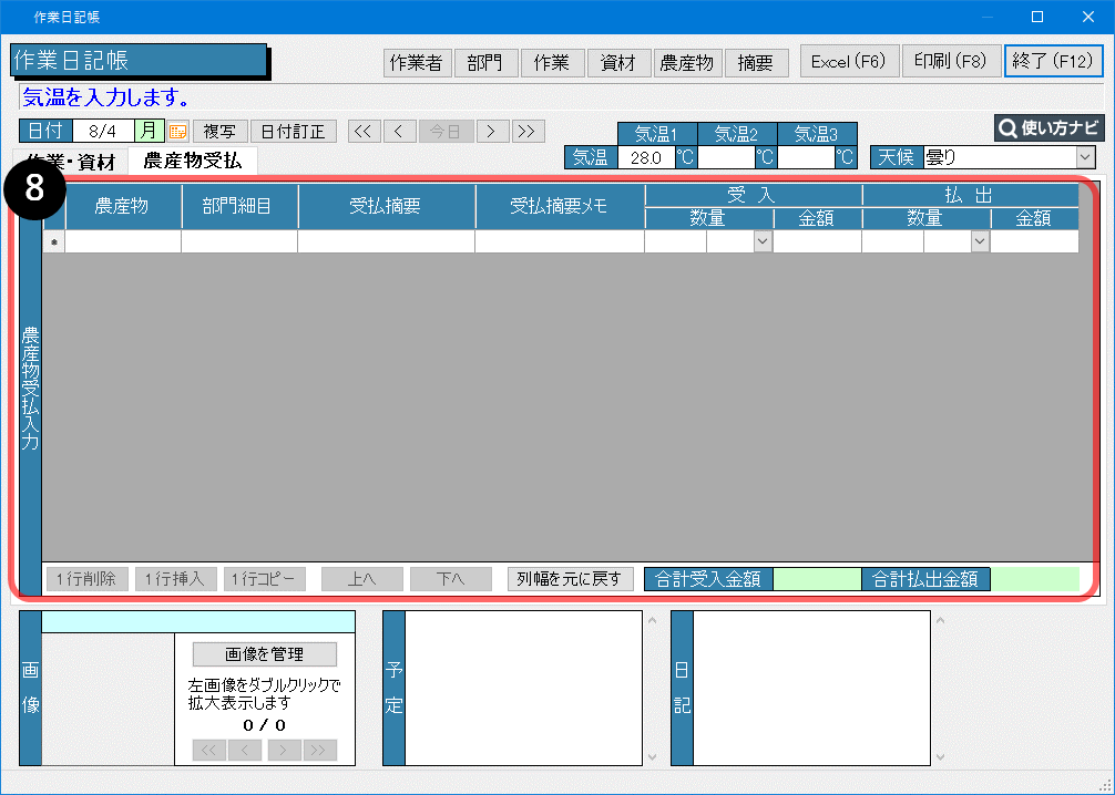 一日分の作業、資材投入記録、農産物受払、および日記をひとつの画面で入力できます。