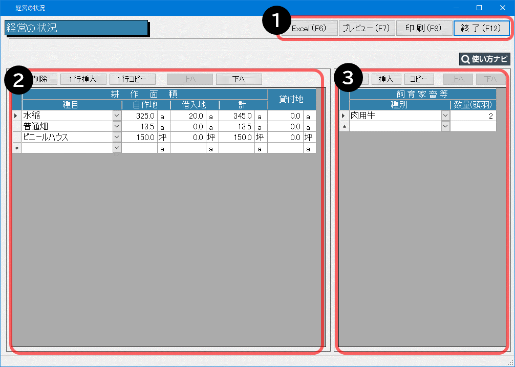 耕作面積や飼育家畜等の登録を行います。
