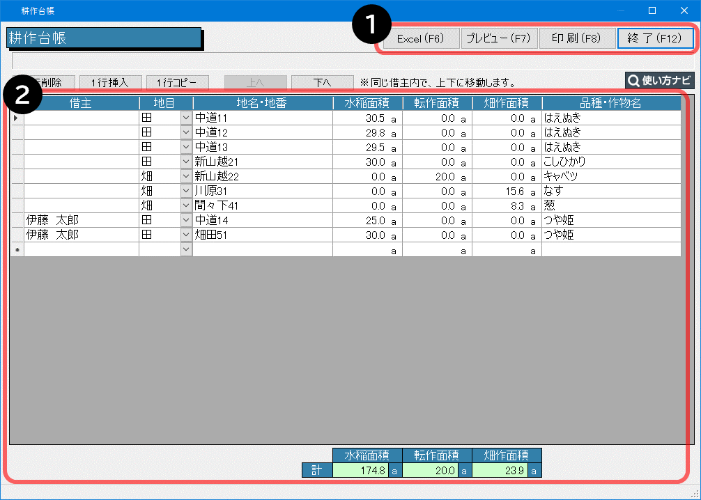 ホーム 【2025年版】「各種状況 (耕作台帳)」について 各種状況 (耕作台帳)とは 「各種状況」の「耕作台帳」をクリックすると開きます。耕作台帳の登録を行います。 目次 各種状況 (耕作台帳)の機能 よくあるご質問 各種状況 (耕作台帳)の機能 ➊ 印刷などの操作を行います。➋ 農地の情報を登録します。 よくあるご質問 「日常業務」カテゴリへ この記事は参考になりましたか? この記事は参考になりましたか? 参考になった 参考にならなかった Q&A番号:25403b