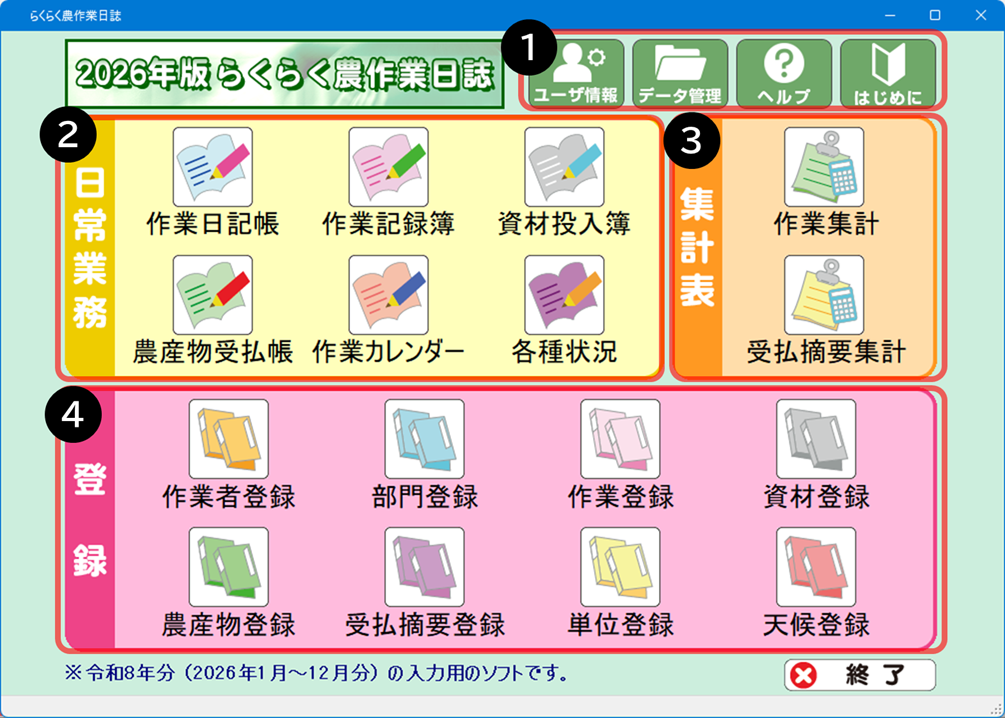 | ❹ 登録 「日常業務」を入力する際に使用する「作業者」や「資材」などの、 基本データの登録を行います。 |