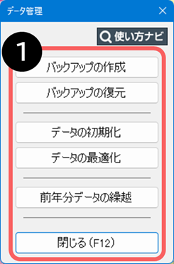 ホーム 【2026年版】「データ管理」について データ管理とは 入力したデータのバックアップや復元、および前年分データ繰越などを行います。 目次 データ管理の機能 データ管理の使い方 よくあるご質問 データ管理の機能 ❶ 「バックアップの作成」や「バックアップの復元」などの操作を選択します。 データ管理の使い方 「バックアップの作成」について「バックアップの復元」について パソコン間のデータ移行について「前年分データの繰越」について よくあるご質問 「データ管理」カテゴリへ この記事は参考になりましたか? この記事は参考になりましたか? 参考になった 参考にならなかった Q&A番号:26102b