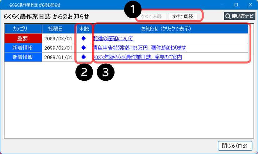 ソフトを起動した際、新しいお知らせがある場合に表示されます。