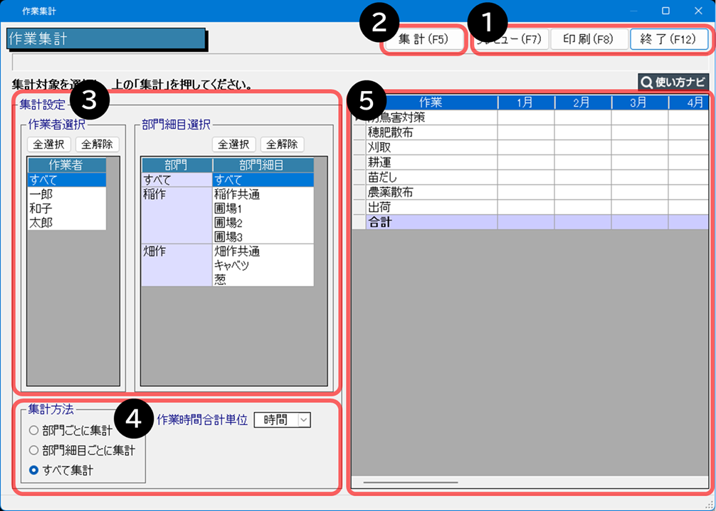 日 ・・・作業時間を日単位で集計します。1日の時間単位は「ユーザ登録」-「生産者設定」で指定します。